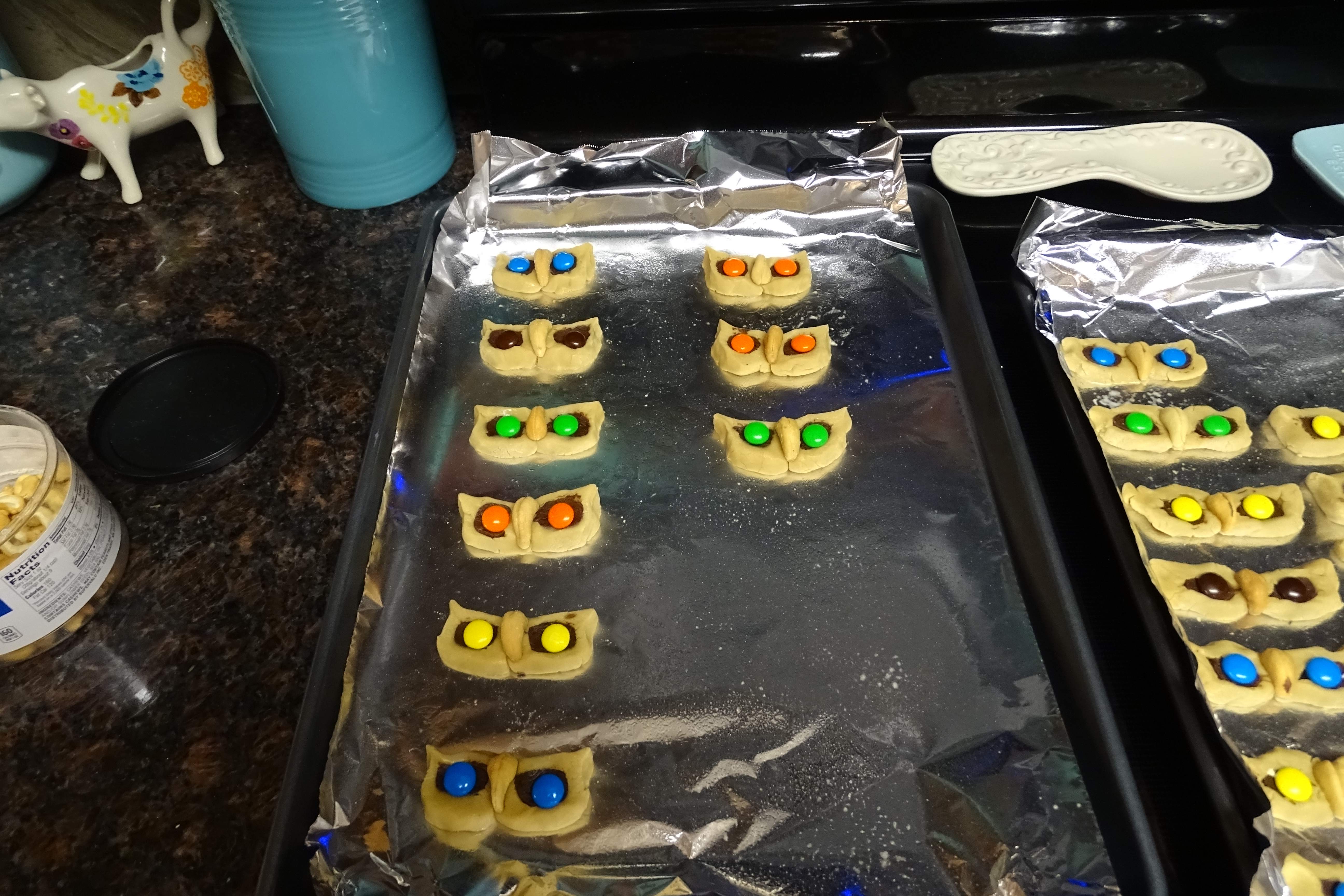 Once you have all your slices laid out and put together, put an M&M on top of each chocolate center, and one cashew in the middle to look like eyes and a beak. I put the same color M&Ms on each cookie, but you could be non-OCD and mix it up. Han and I had a discussion about this time about which direction to set the cashew. I honestly haven’t ever noticed which way I place it, and it looks like an owl either way.