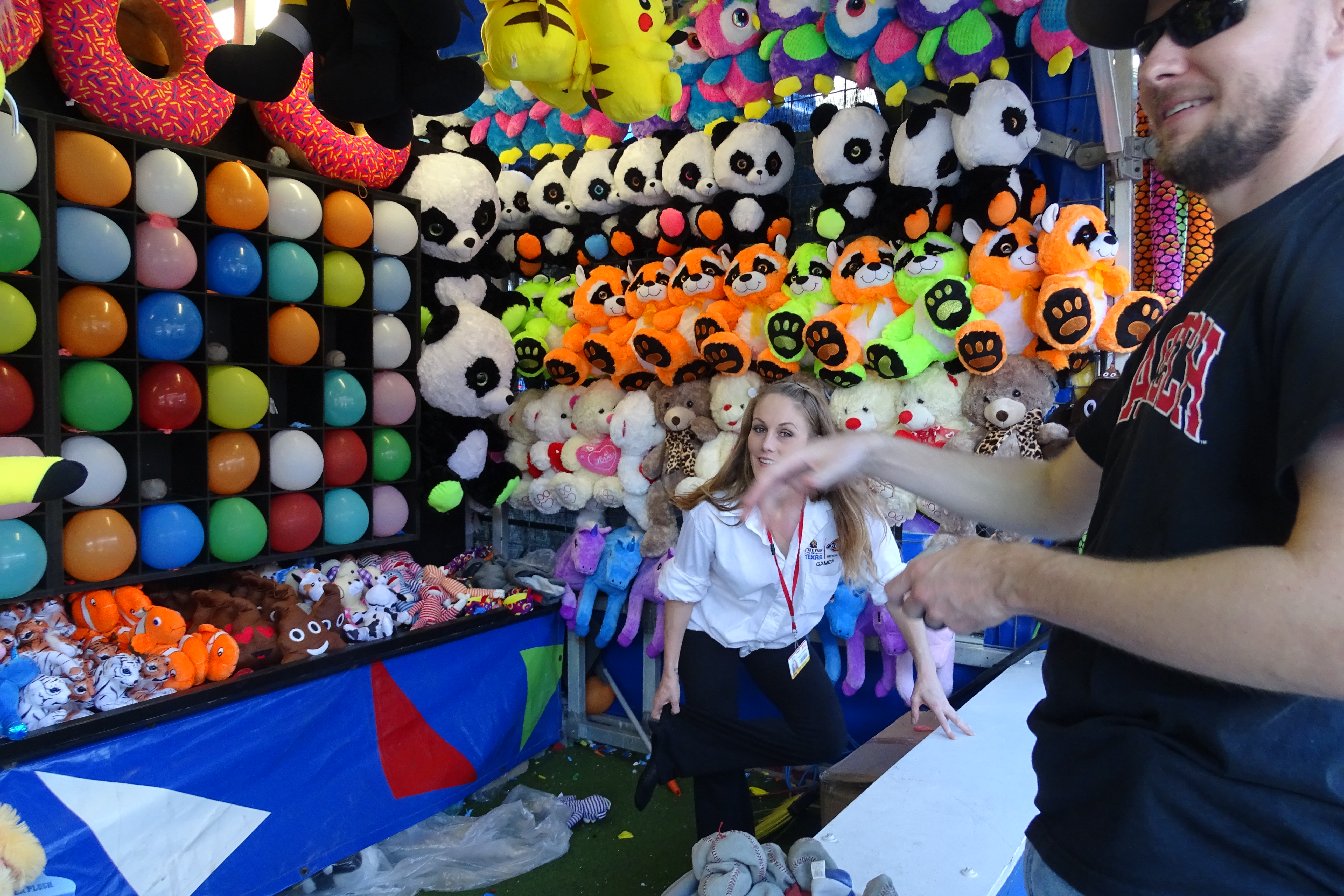 We played several more games, and Steven won two red sock monkeys (for the boys), and a giant stuffed monkey before we tried to decide what to do to finish our tickets. Steven was most interested in trying to win a Spurs basketball, so we decided it was better to try at that and possibly not win, rather than try something easier to win and end up with more junk we didn’t need. And… HE MADE IT!!! So, all said and done, we carried a ton of junk (including 2 basketballs) all around the fair.