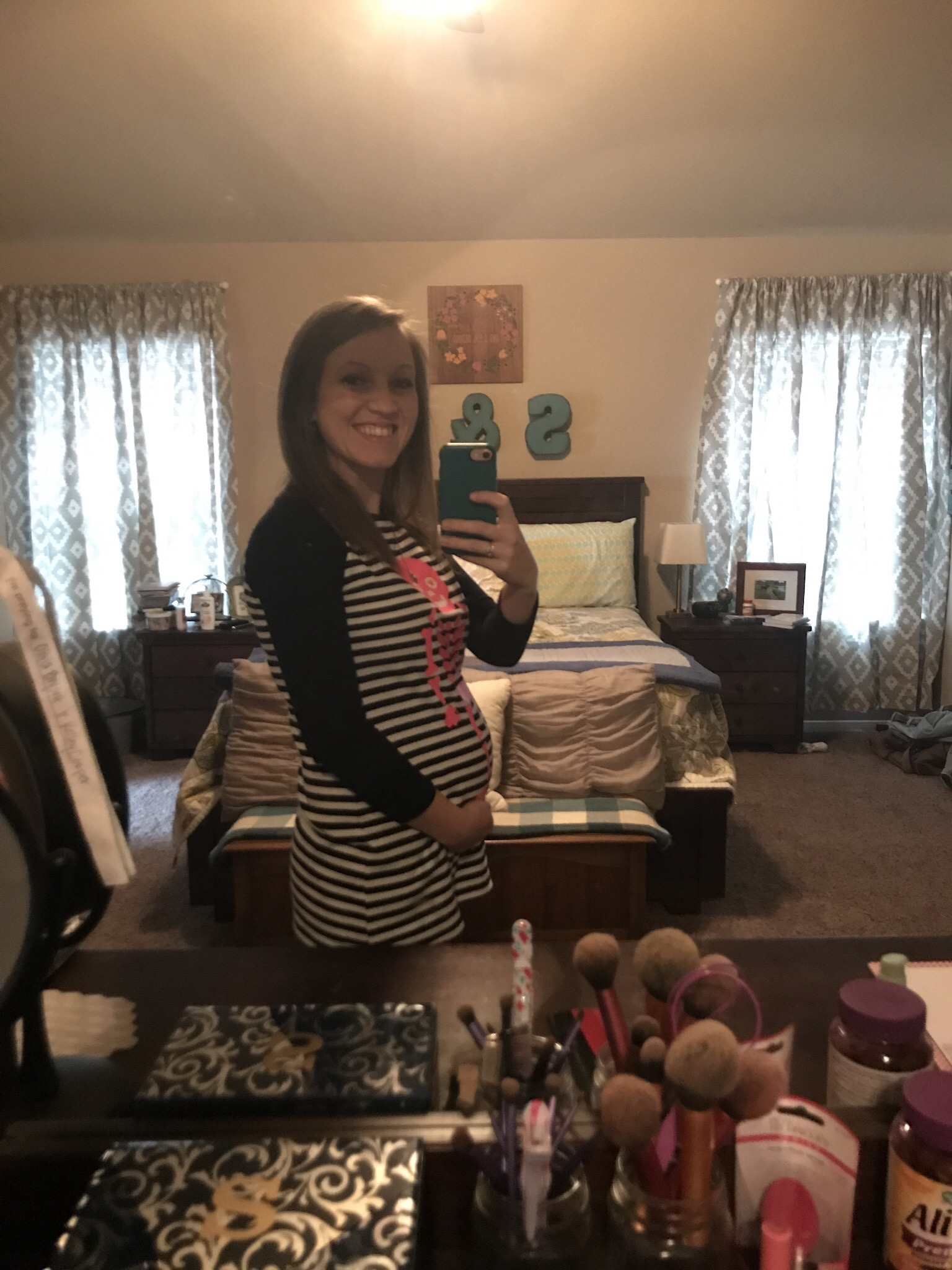 We have been just rolling along this month without anything really huge since the last Bump-date. I had an OB appointment on the 20th, and it was pretty uneventful (which is good!). Her heart rate is hanging in the 140s and everything is moving along. In about four weeks (so six weeks from that appointment), I’ll have to do the gestational diabetes test, which I’m a little nervous about, and that’s when we drop from appointments every four weeks to every two weeks. Our OB said our big ultrasound showed that Ollie is breech right now (which the ultrasound tech had told us as well), but that even if she was facing the right way, they wouldn’t consider it for sure at this point, and that she has plenty of time to flip. We’ll do another sonogram at 36 weeks to check position, and then go from there. Obviously a C-section isn’t choice A, but if that’s what needs to happen, I’m not worried, and I’d be okay, and not devastated or anything. Right or wrong, I don’t really have a “birth plan”, or “dream birth” like I’ve heard some girls say– I just want to have a healthy baby, hopefully with some pain reducing medications, but I’m pretty go-with-the-flow as far as how that happens. And her current position explains why I feel the need to hit the ladies’ room constantly and on a dime– I have little feet tap dancing on my bladder!
